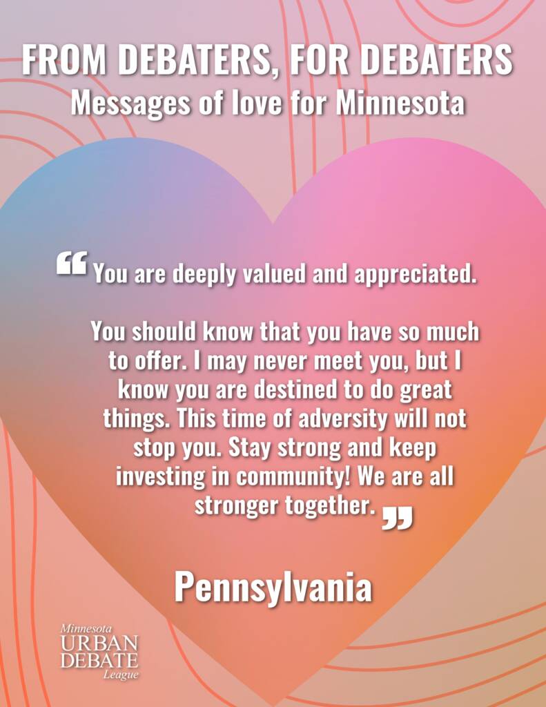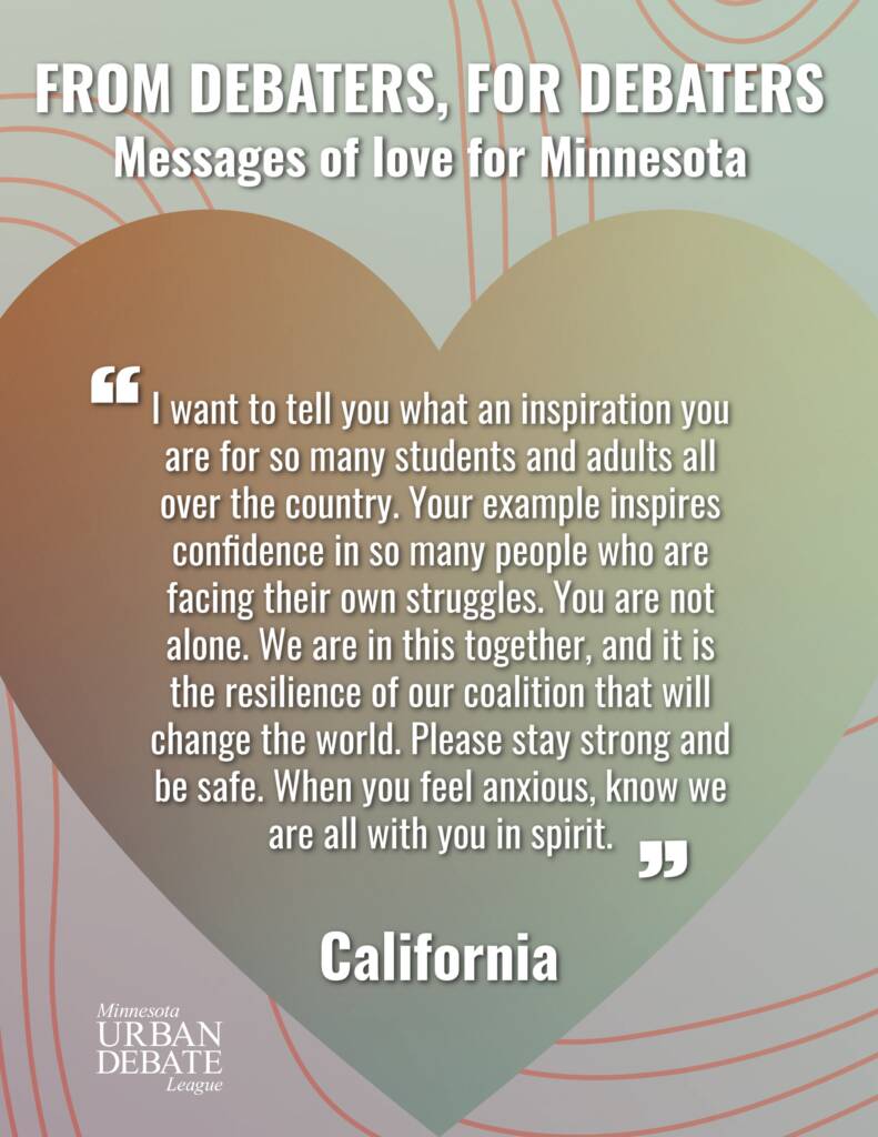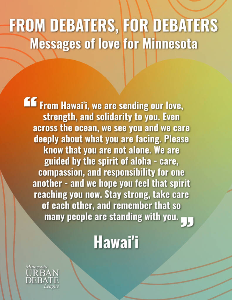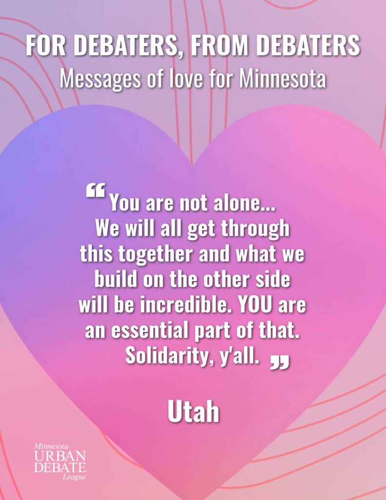 150 debate community members from across the United States sent messages of love and solidarity to our students. Coaches, debaters, volunteers, and alumni from nearly every state in the nation showed up for Minnesota. Donations are coming in keep virtual debate running and to make sure every student who couldn’t safely leave their home still felt seen, celebrated, and supported.